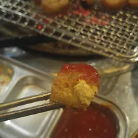 양파튀김과, 3가지의 소스를 찍은 치킨 바베큐를 얹혀서 알차게 한 입에 먹으면